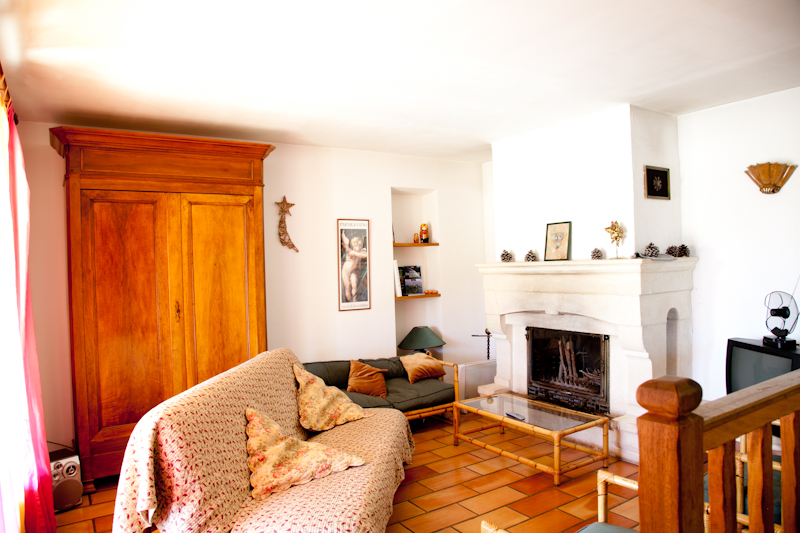 | Accès au salon en léger contrebas (une marche), un canapè 3 places, deux fauteuils, tv, hifi, accès internet, livres adultes, enfants, jeux de société, cheminée; accès à la terrasse par une grande porte vitrée.